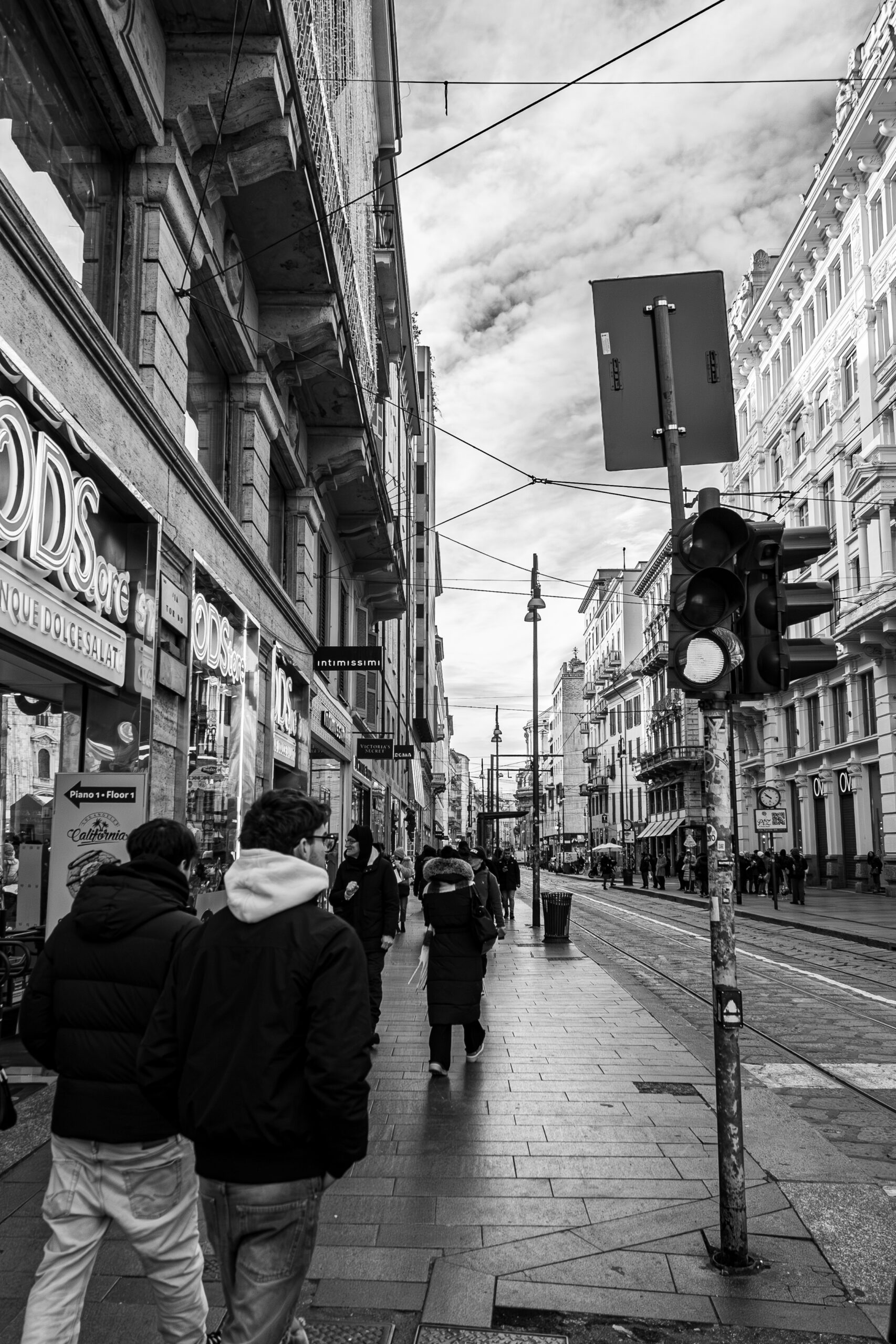È una Milano che rinuncia al colore per mostrare la sua struttura: severa, elegante, instancabile e profondamente malinconica.