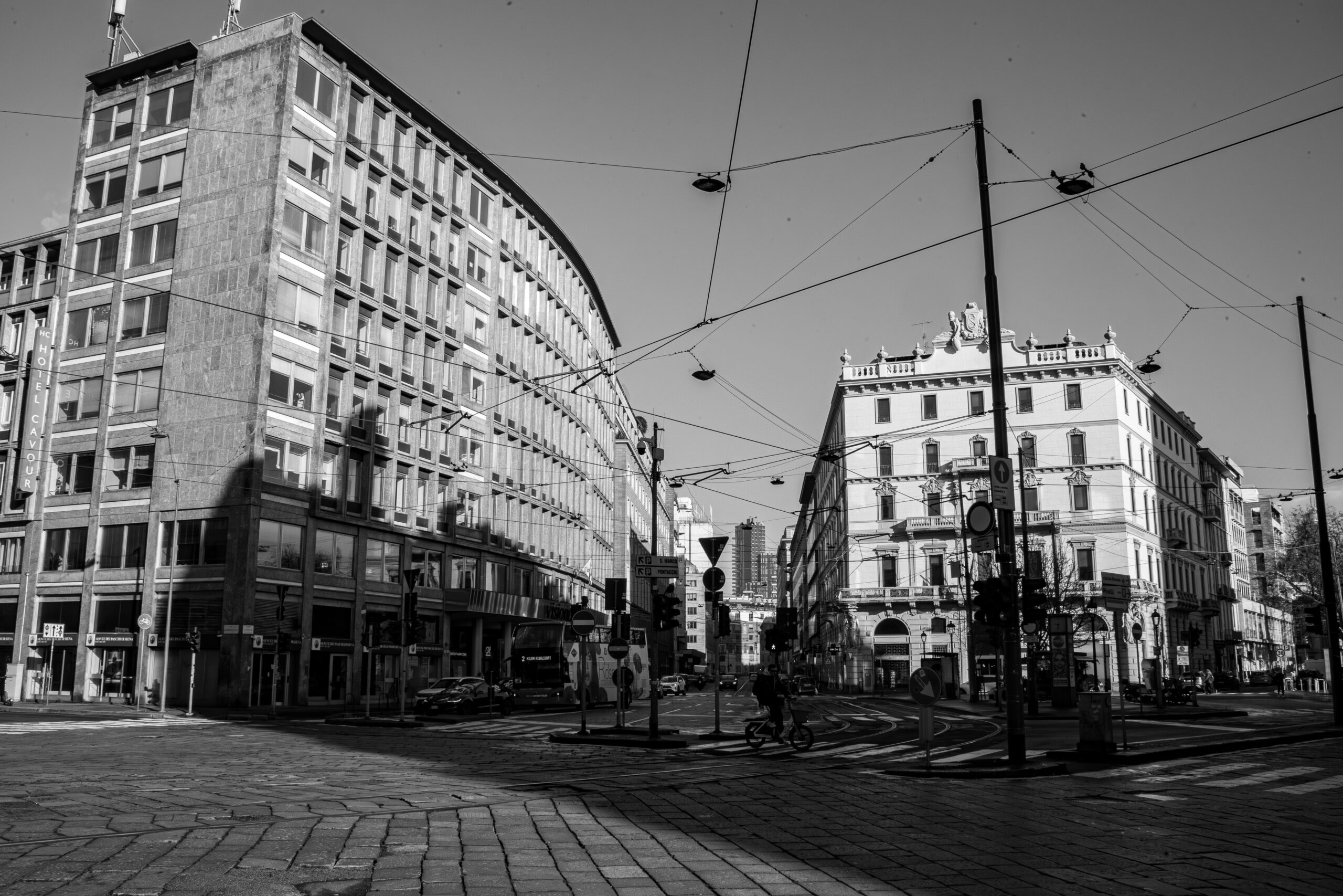 È una Milano che rinuncia al colore per mostrare la sua struttura: severa, elegante, instancabile e profondamente malinconica.
